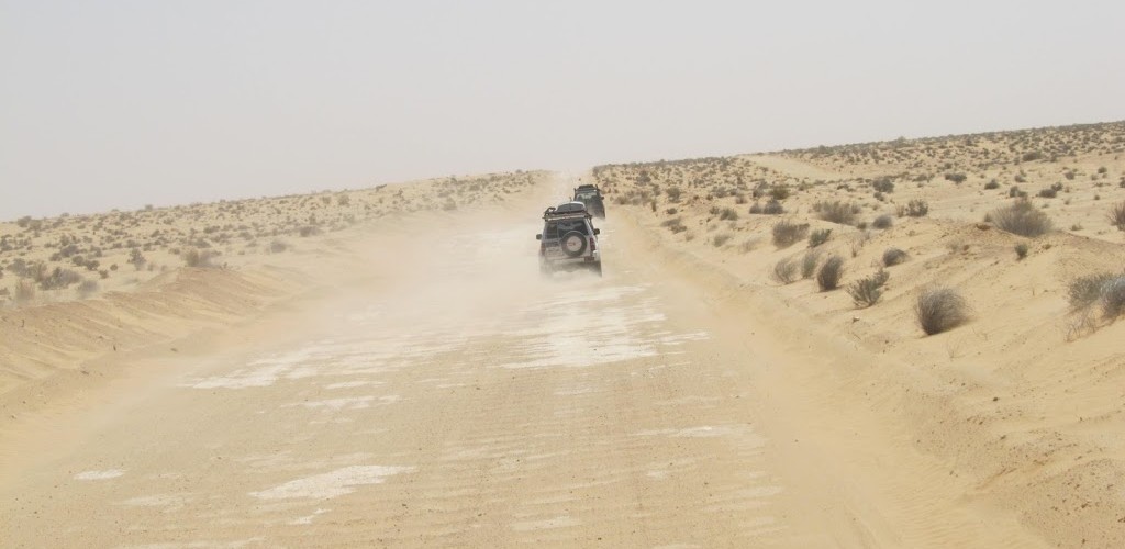 Kurz nach Mittag fahren wir dann los Richtung Süden, zuerst über Sandpisten, entlang am Djebil-Nationalpark, dann direkt durch ein Dünengebiet. Die gesamte Strecke von Douz zum Tembain umfaßt ca. 120km. Der Dachträger bereitet mir anfangs in den Dünen einige Probleme, wir müssen ihn nochmal einrichten und fester verschrauben. Nach der Durchquerung des Dünengebietes kommen wir beim Cafe Dattea vorbei, wo wir Schutz vor dem noch immer sehr starken Wind suchen und auf einen Chai einkehren.
